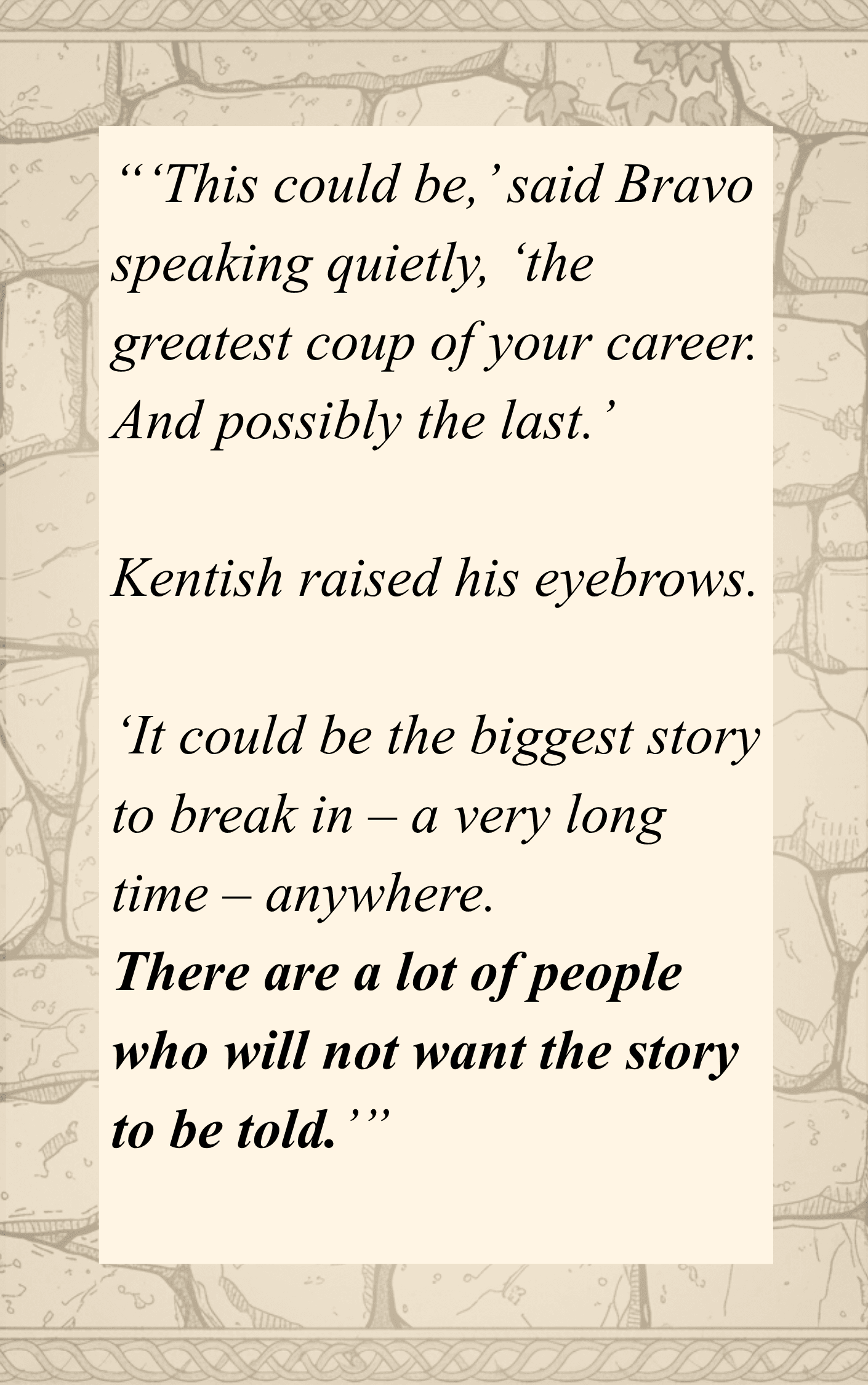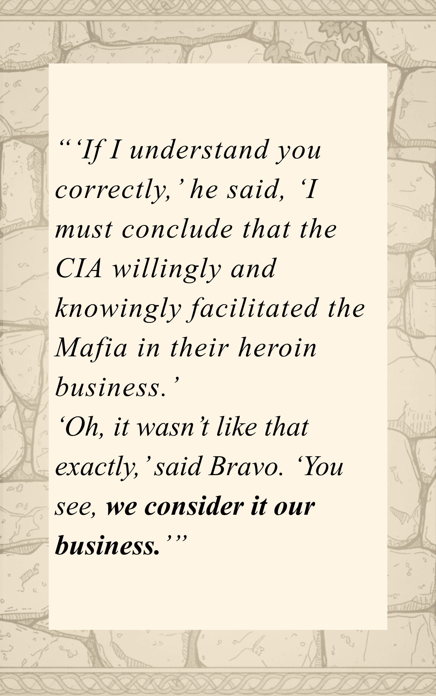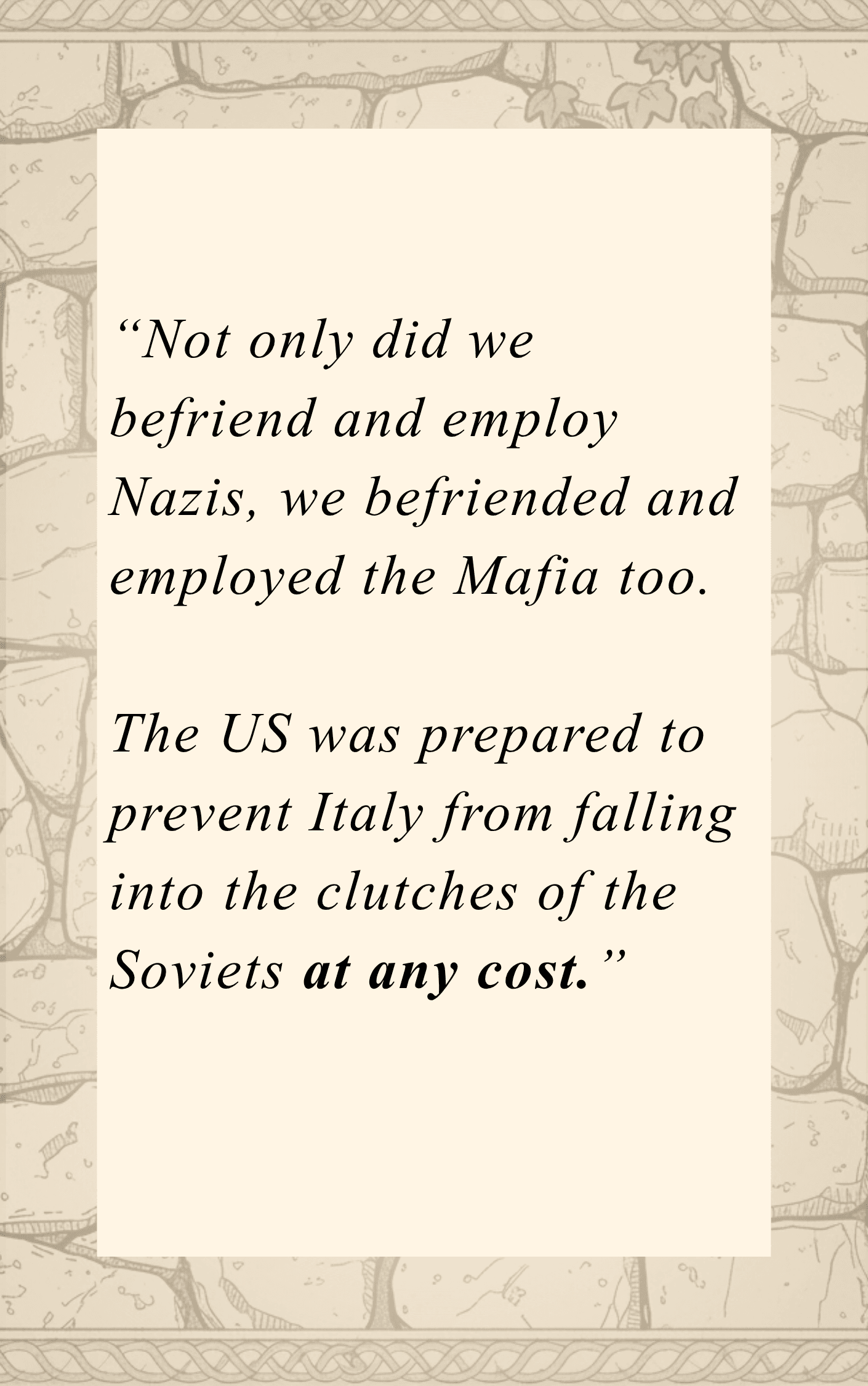 Journalist Peter Kentish brings his family to the small medieval town of Colletta under the guise of a family holiday. Behind closed doors, he is conducting a series of private interviews with former CIA Agent, Robert Bravo. Bravo’s insider revelations bring light to the CIA’s collusion with the Italian mafia, all in the name of preventing communism from taking hold of Italy.